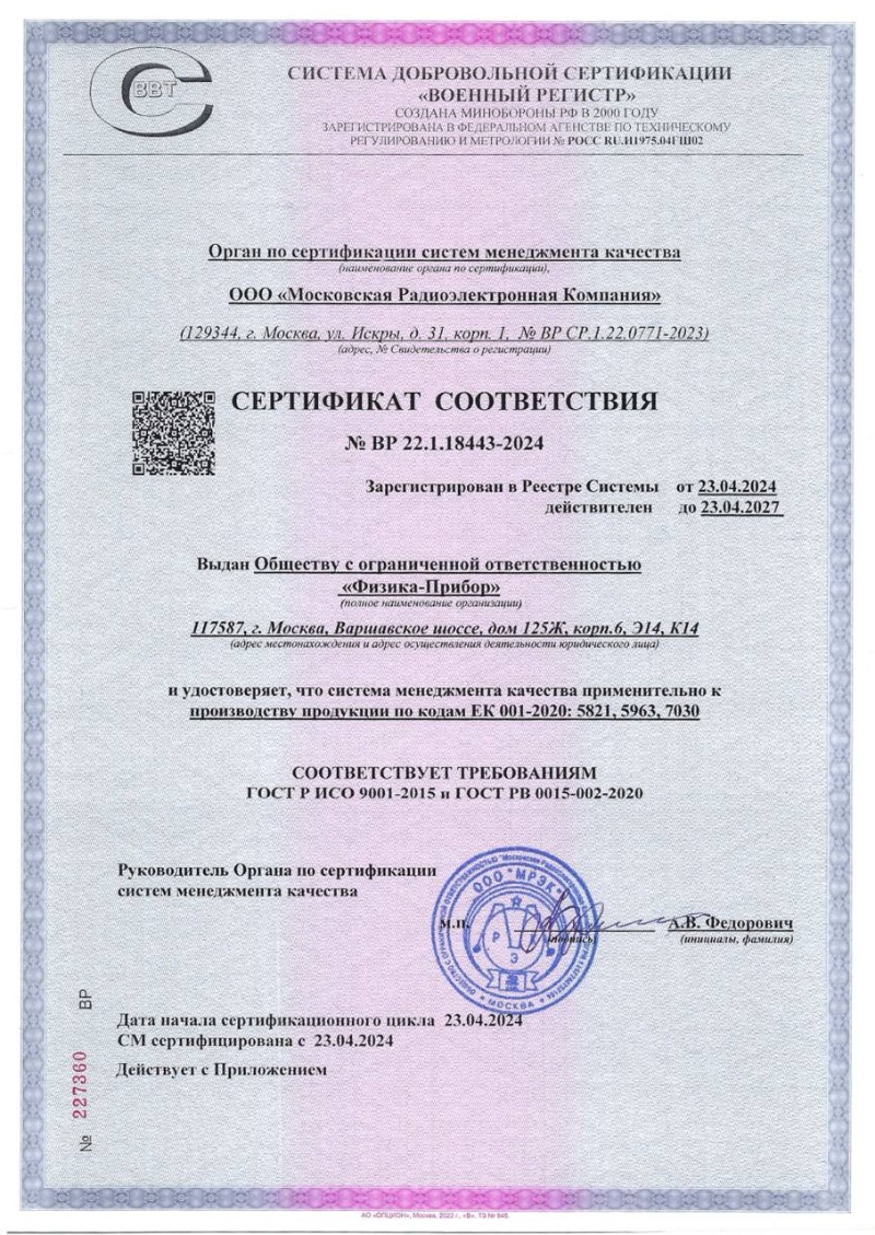 06 апреля 2026 года в ООО «Физика-Прибор» состоялись инспекционный контроль и ресертификация системы менеджмента качества (СМК) применительно к кодам деятельности ЕК 001-2020: