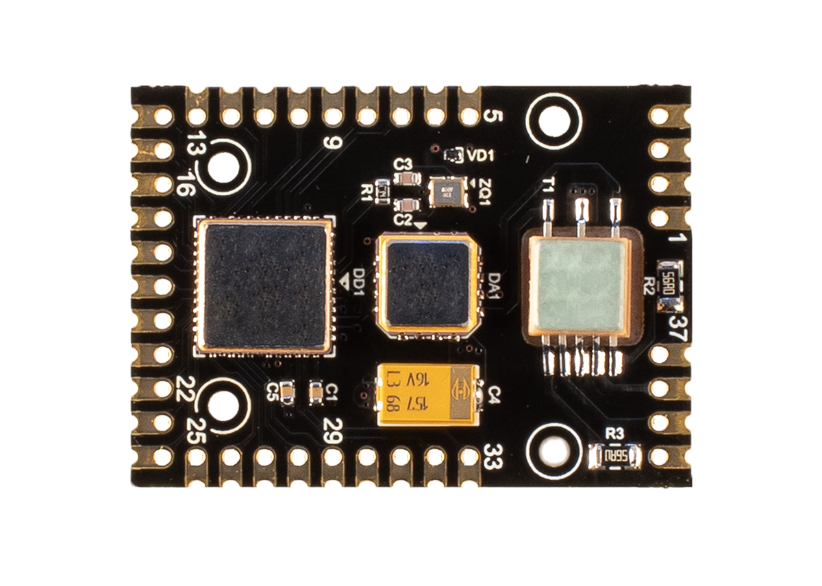 Все выводы модуля расположены на дюймовой сетке, что упрощает процесс подключения модуля к универсальным отладочным платам. Монтаж в аппаратуре может осуществляться следующими способами: пайкой проводами типа МГТФ, через PLS-разъемы или поверхностным монтажом (SMD), благодаря наличию металлизированных контактных площадок на плоскости основания модуля.